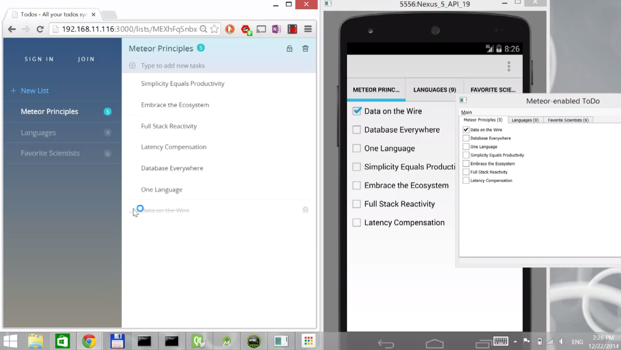 Enter Qondrite, a lightweight QML wrapper for Asteroid, a Javascript client for Meteor. With Qondrite, you can use Meteor as the source of your models (yes, everything shown goes through models, not hardcoded lists and data). To check the feasibility, I took the Todo example from Meteor (meteor create –example todos) and used Qondrite to interface to the meteor application. As usual, the source of this demo is available on github.